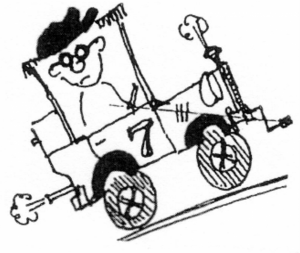 By the way, there’s a story that goes along with this each day: the adventures of the good-hearted but not too bright, eponymously named Frank Partsoff. He is matched against a worthy opponent, the villain; that super-sharp but mal-intentioned Percy Pursestrings. After many preliminary heats, where Percy, with his sleek and high-powered limousine, tried to cheat the rattletrap Frank, the big final is on. Naturally they tie; and again to demonstrate the principle of Unity, they join forces with their respective virtues – Good hearted intelligence – to become the most formidable rally team on the circuit!”