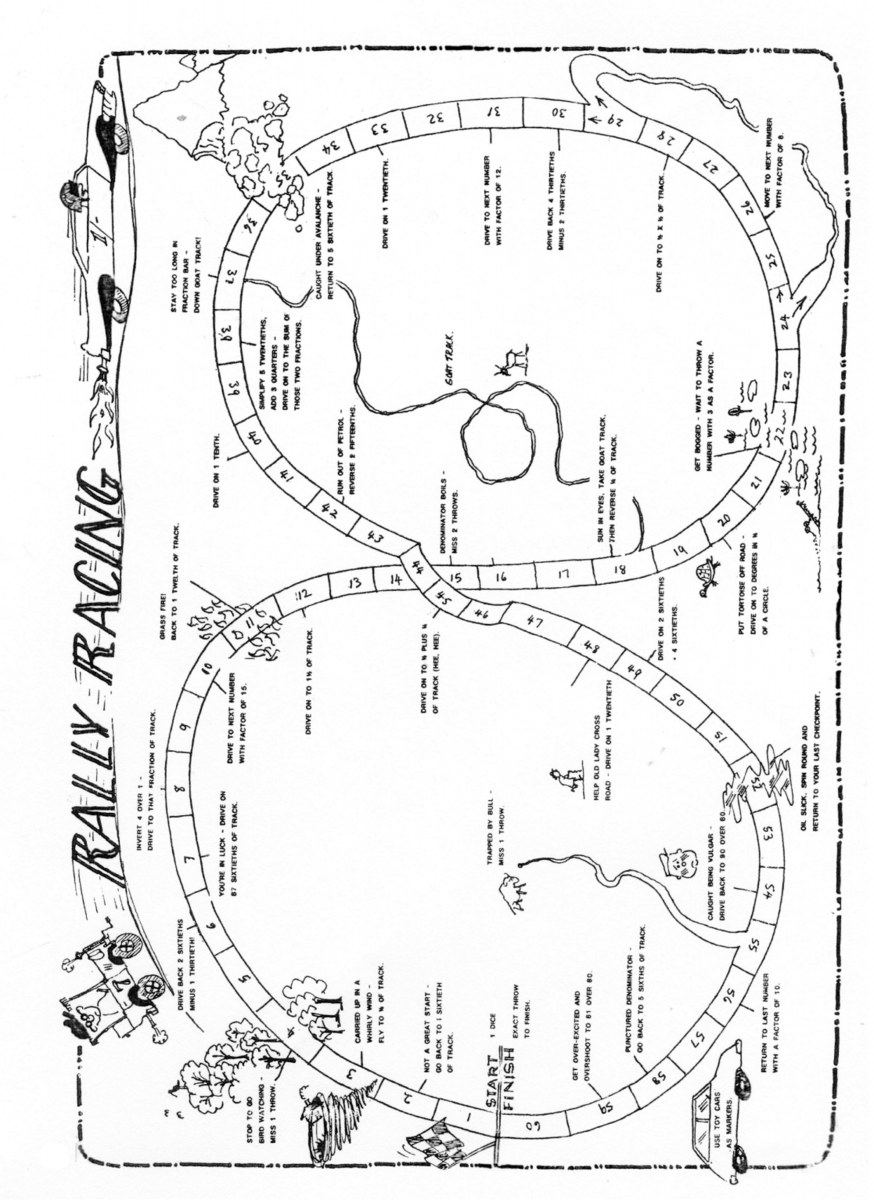 “The ‘rally track’ stretched across 2 tables; to make a workable maths situation, it was 60 kilometers long, divided with different colored flags into its major ‘factors’ (12, 10, 30, etc.). there was a square for every kilometer; it was a dice game, and all the traps and so on were fraction oriented. Say a child might throw a 6; they would then move their little car to – oh no! – the Oggy Boggy Swap square (graphically drawn by them I might add).