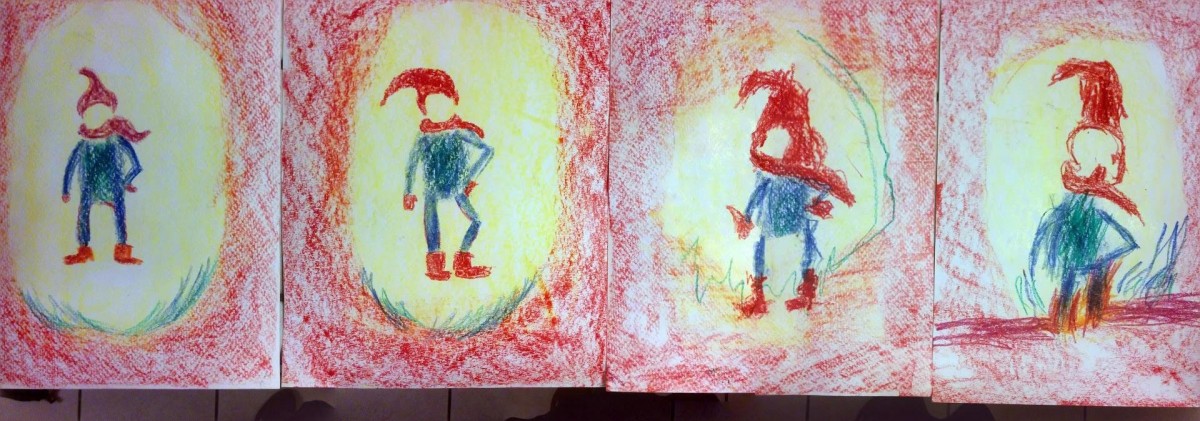 Natasha: I don’t name it “a lesson” when we sit down to draw (paint, model or sew) together. We have been drawing together since he was 3, he would just watch and copy what I am doing or do what he wants or sometimes he copies only a few elements of my drawing and mixes them up on his own. Here is an example of how we drew a gnome with block crayons, he didn’t like that the hat turned out too big. So he decided to draw one more gnome (I did the same), but his second one turned out completely messed up. Especially the shoes. I came up with a story about a Long-Shoe Gnome who hid all his secret things in his shoes, and nobody even guessed to check there, and that he came to my son in a dream and thanked him for drawing him such big shoes. The story was the only thing that helped my son not to fall apart. I am just trying to make sure I will be prepared for the other cases like that. What if something goes wrong.