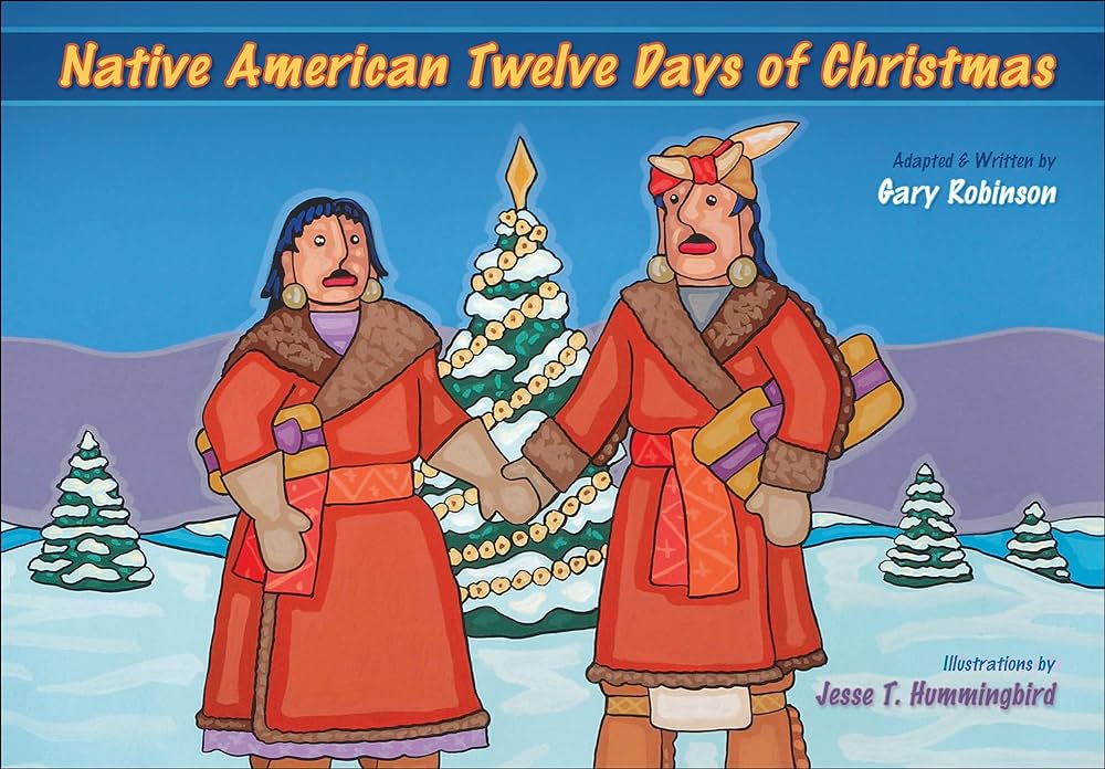 Employing the source material’s foundation, Robinson adapts the lyrics to include culturally significant actions, items, and entities. Straightforward text contextualizes each adapted lyric, while Hummingbird depicts wide-eyed characters engaging in yuletide scenes.