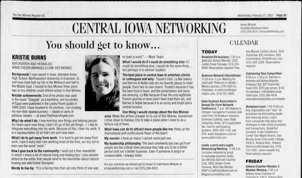This section of the Des Moines Register focuses on getting to know local Iowa business people and introducing them to the business community. In this article they interview Kristie Burns about her work with The Avicenna Institute as well as Earthschooling.