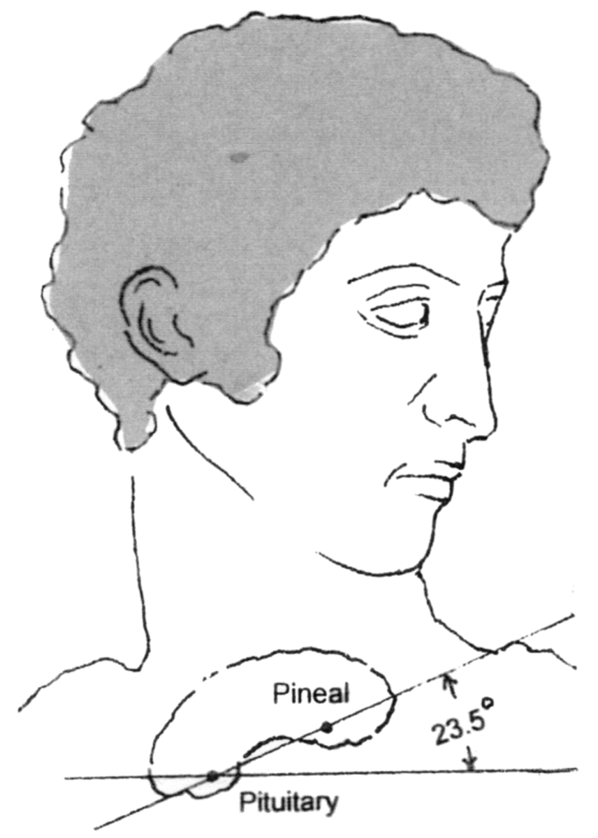 HEAD POSITION is an indication of ego status; held too high is Luciferic pride, too low, matter weighted Ahrimanic effacement. The Christ-like perpendicular is determined by the relative position of the pituitary (earth) and pineal (sun) glands; the ideal angle between the two being 23.5 degrees, the same as that of the horizontal line) earth with the (angled line) sun (see below).