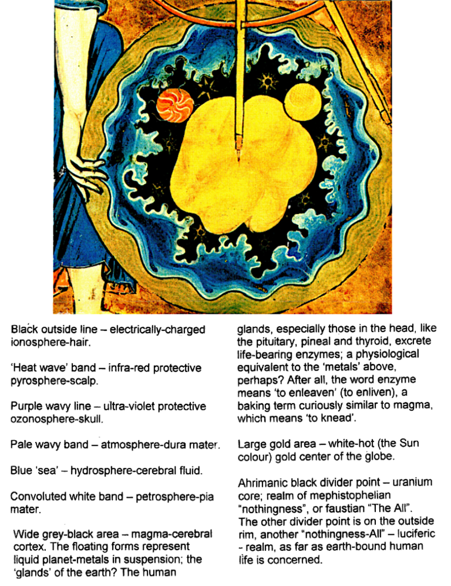 At the very center of the brain, there is supposedly a tiny space of nothingness; as alluded to earlier, this is the Mephistophelian perception of Spirit. Here we have a horror vacuui; indeed, one equivalent to that which is thought to exist in the very center of the earth, beneath the uranium even. In the had at least, this provides the possibility for, in the distant future, the development of Spirit Man, ‘fully transformed physical body’. The mission of the human head (and the earth) being ultimately to be re-born as spirit.