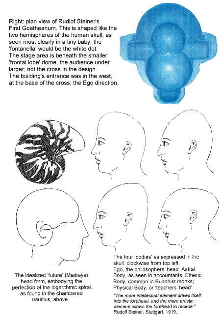 The small sphere of the frontal lobe of man interpenetrates the larger parietal-occipital sphere at the rea; just like the First Goetheanum. One could almost weep at the sublimity of this structural-artistic masterpiece. After all, the laws of the physical body in general, and its epicenter the head in particular, are those of architecture. In fact, the Temple of the Body, our own House of the Word, is first of all structural in nature; hence we can even consider the whole body to be a head; the later developments, chest, abdomen, and limbs, being mere appendages. This is literally the case with the – Polarian – invertebrates; ‘head’ creatures par excellence.