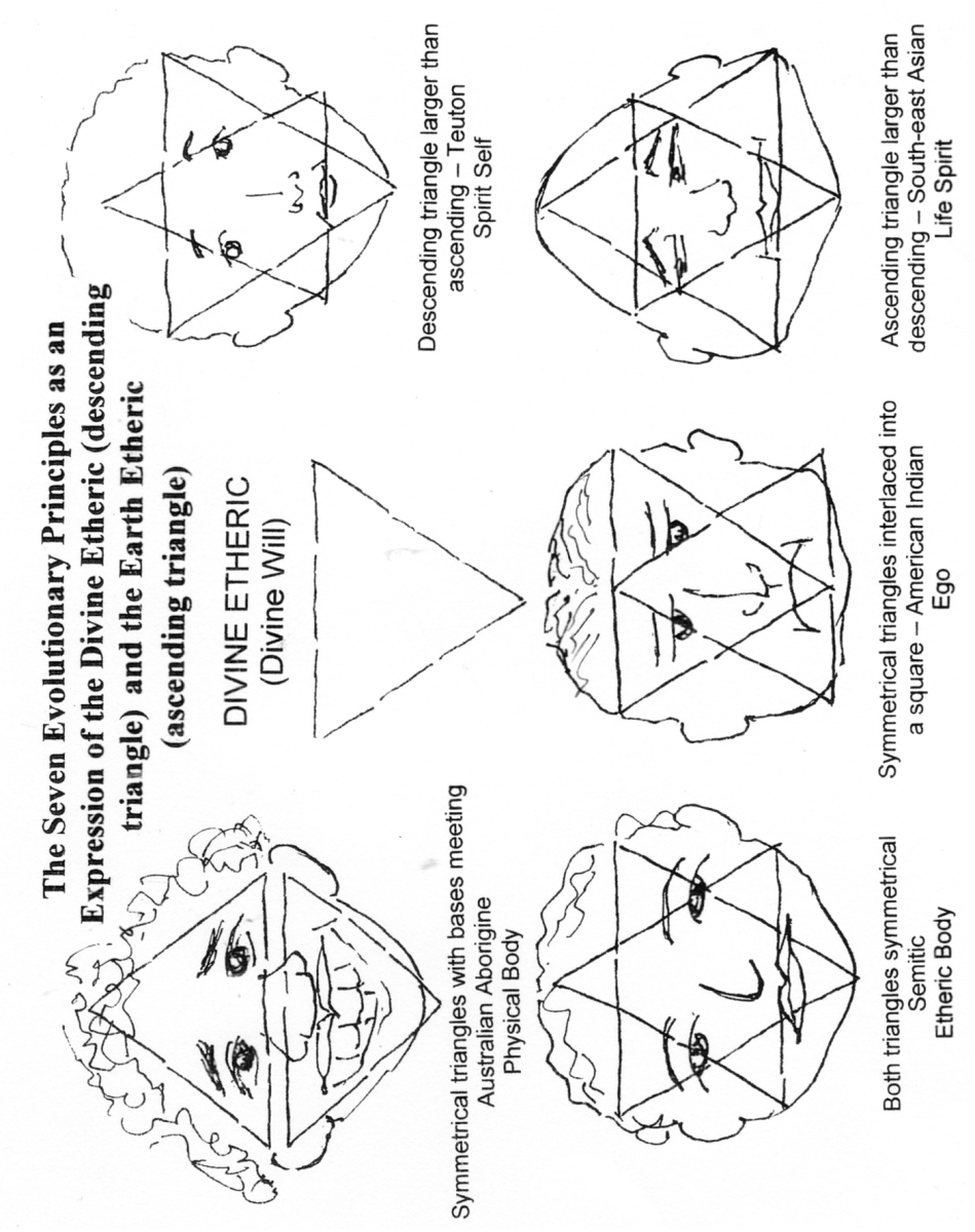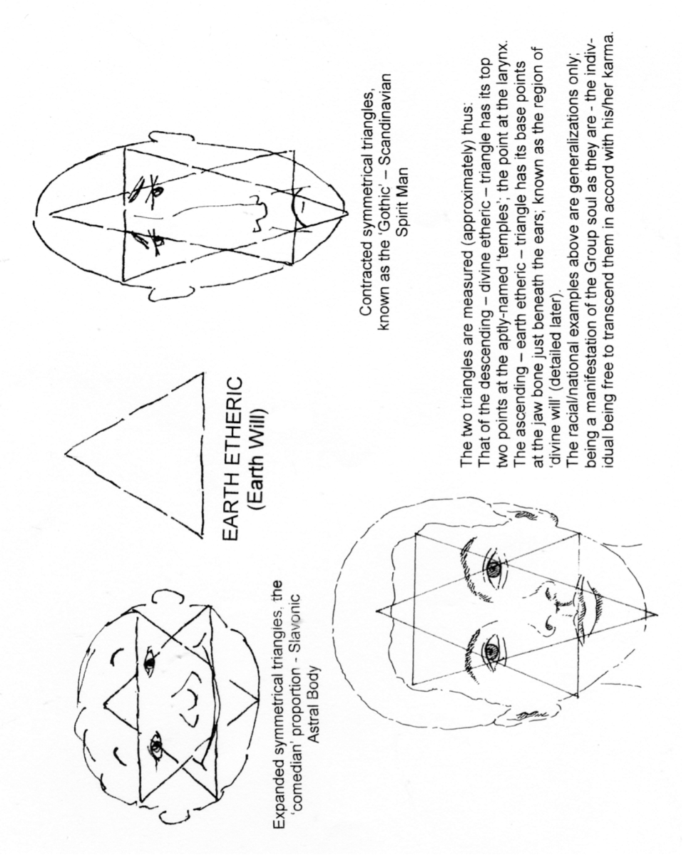 Another duality in head forms, and probably the most important, is based on the Seal of Solomon, the interlaced descending and ascending triangles earlier mentioned. A balanced incarnation is indicated by a symmetrical hexagram geometry, with the two triangles in harmony. However, some souls, common in Orientals and earthy folk (to generalize, individuals of course being free to depart from their racial or cultural stereotypes), have the ascending triangle dominant: this represents earth will.