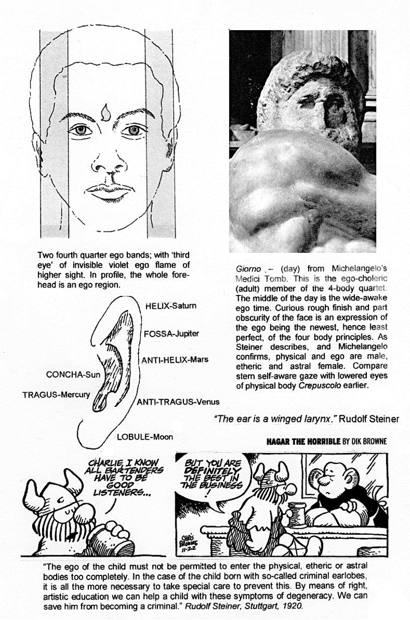 Backward slanting ears, ideally at twenty-three and a half degrees off the vertical, like Steiner’s are related to divine inspiration: forward slanting rather inspired by the affairs of the world. The sculpture of the ear in general is related to orientation: experiments where the entire ear is waxed over to a smooth surface (from form-etheric to surface-astral) result in the owner having no idea from where a sound emanates.
