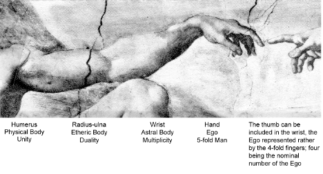 But there is yet another four-fold man; this is found in his horizontal axis, seen especially in the outstretched arms. From the center we have the unity principle in the upper arm (humerus) physical body; the dualityforearm (ulna-radius) ether body; the multiplicity wrist astral body; and fourthly the 5-fold hand (the number of man) ego.