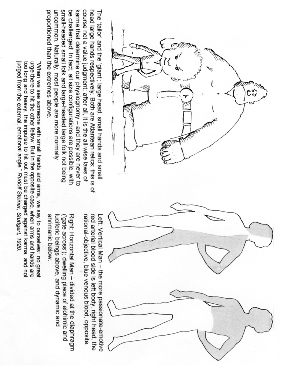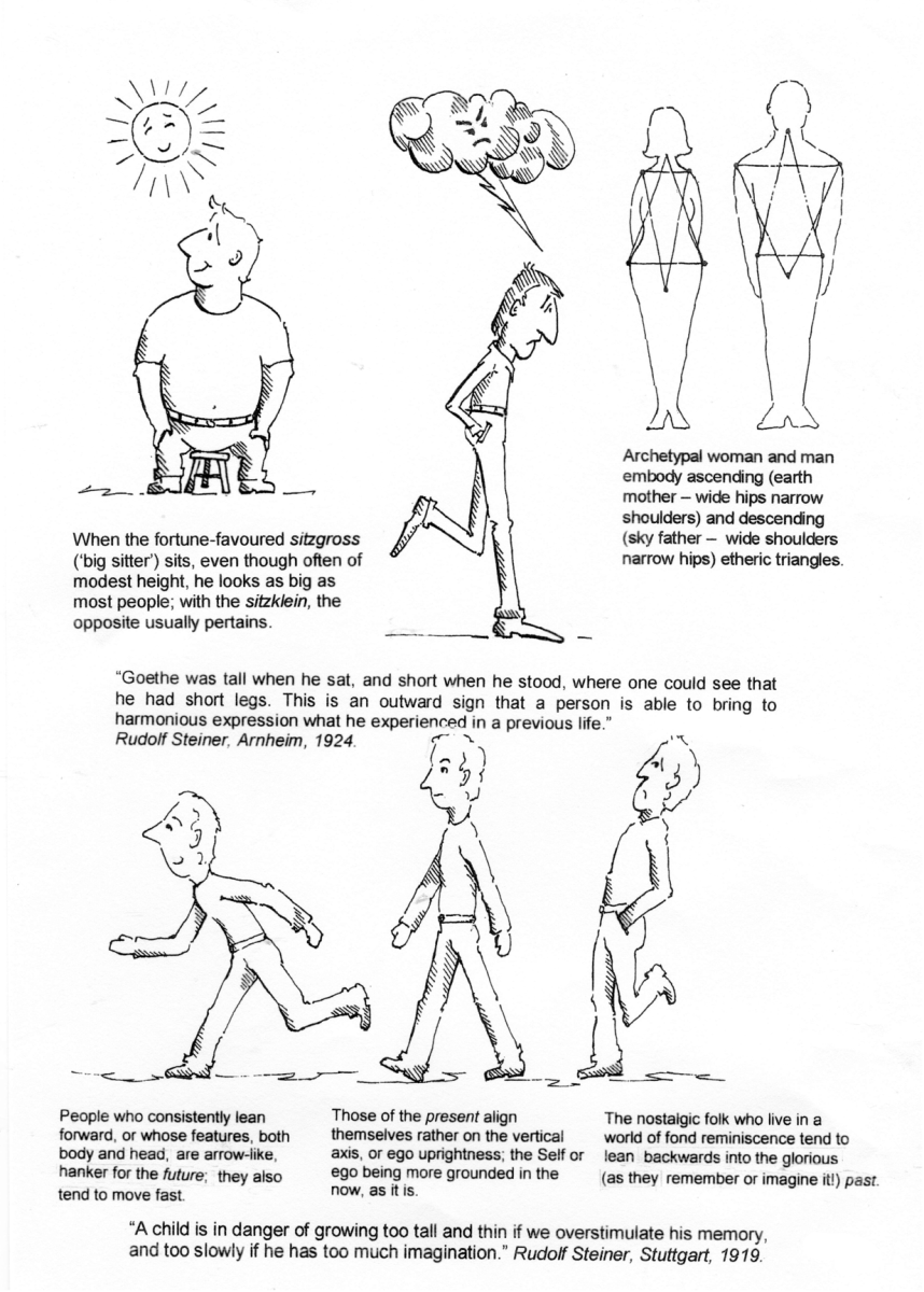 Then there’s the sitzgross. Steiner gives, as an example of this vertical man, the great Goethe, a person with a large boy and short legs. These people tend to have a harmonious incarnation; no doubt earned by many goods works in previous lives. Alas for the short body, lanky-legged folk – one often only has to be in their company for a short time to unwittingly share in their ill luck!