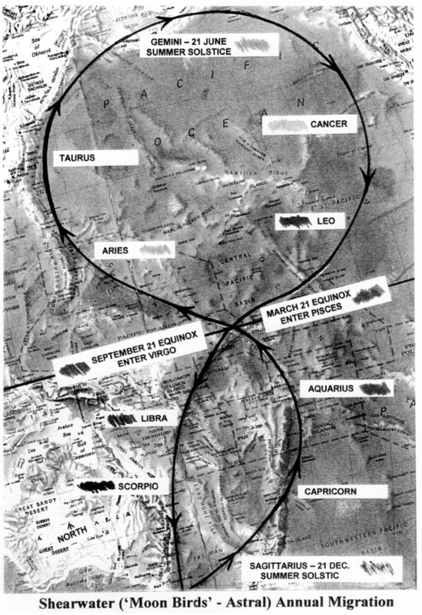 When the sun is at its extreme southerly point, in the sign of The Centaur in the southern Summer Solstice, the moon birds are living the high life on their Bass Strait islands holiday home. As the solar orb turns (which is what the word ‘tropic’ means) and heads north again to Capricorn, the birds obediently follow; then through Aquarius to Pisces on the Equator When the sun crosses the girdle of the world into the Northern Hemisphere, so do the birds – onto Aries and Taurus, to is furthest point north, on the June 21 Tropic Summer Solstice.