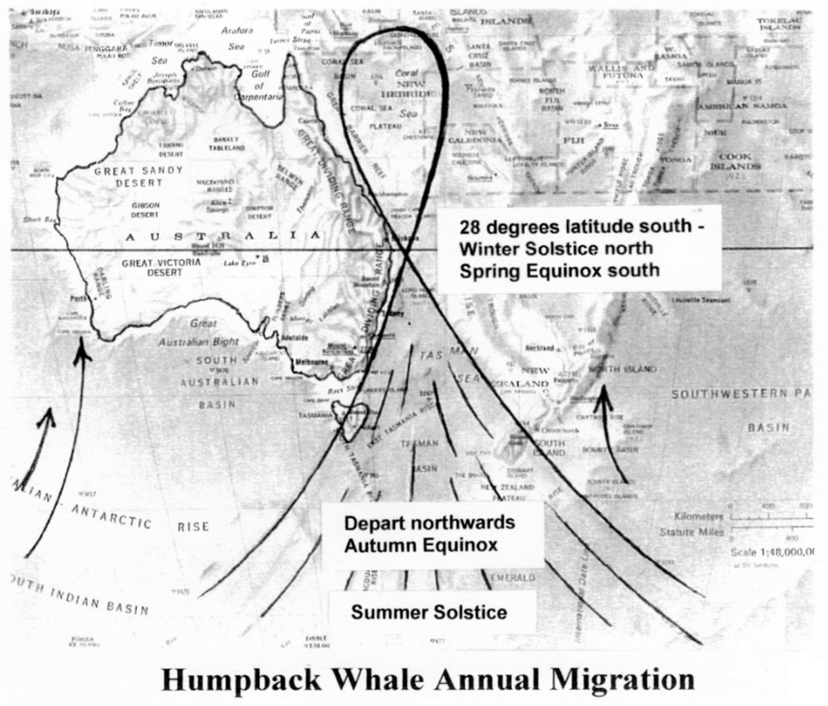 Here the herd spent the late winter, after having passed 28 degrees south around the Winter Solstice. After their happy sojourn, the singing called them south once again; a journey in which they began to describe a beautiful loop, like the letter L running down the Queensland coast and crossing their northward pat at – yes, 28 degrees south again! This time it was right at the Spring Equinox.