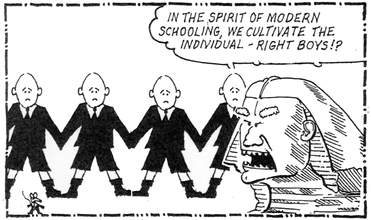 The Chairman ruffled some papers “I’m trying to sort out the legal situation here,” he said slowly “the State enforces a compulsory education law – a child MUST attend school – then they expel them, in effect forbidding them to attend school, a crime incidentally for which the parents are liable. What’s the answer? Is this an attempt to drive the child into welfare care of some kind? A kind of unwritten agenda?” Nobody could answer this one, but Vicar X. Ausize mounted a last desperate defense of the ‘If in doubt, chuck ’em out.’ policy.